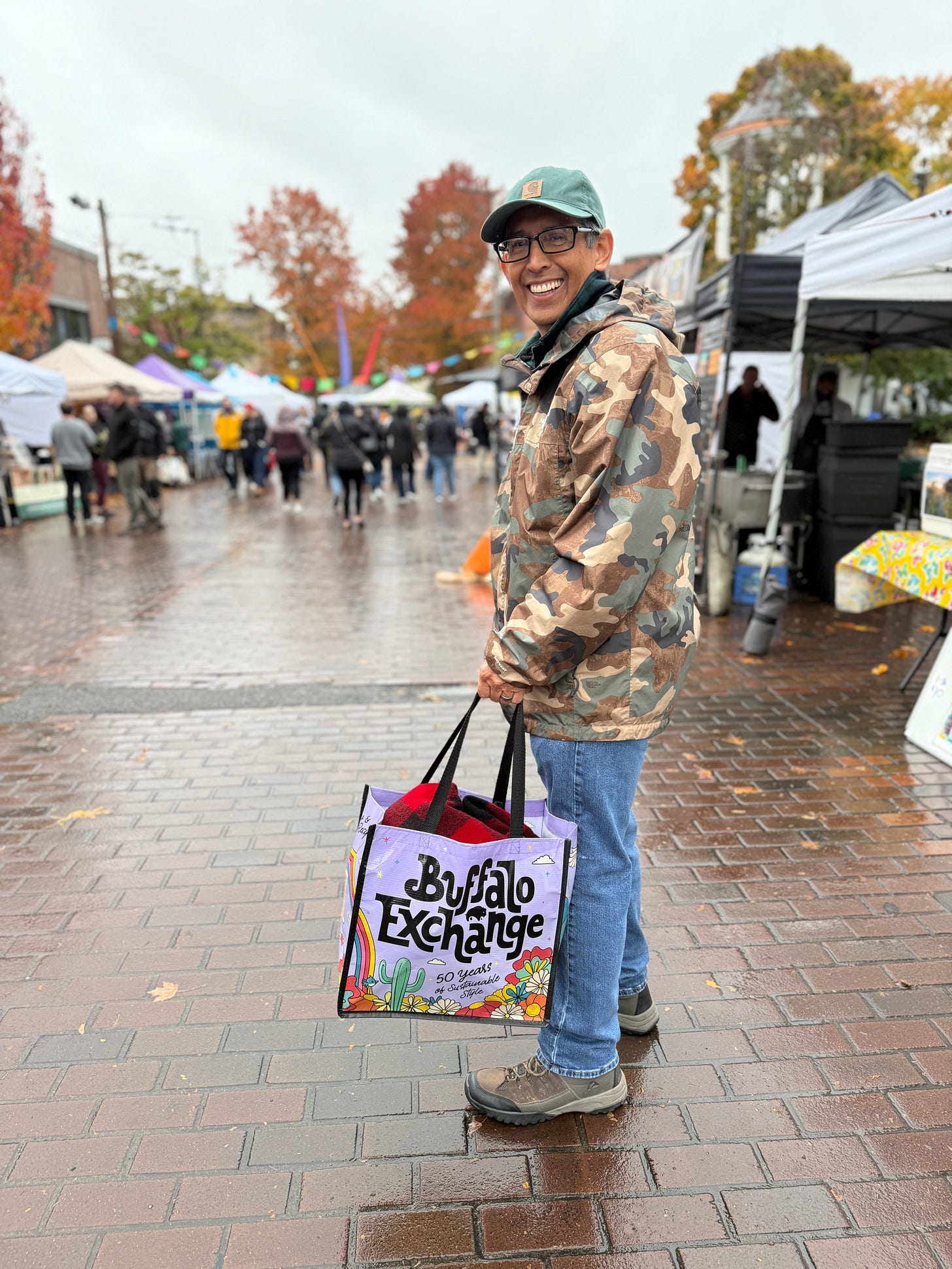 Recently, while visiting Seattle’s Ballard Neighborhood, I made my first visit to Buffalo Exchange, a chain of stores specializing in vintage and gently-used clothing. Below is a picture of my husband Robert carrying his thrift store find, a vintage Woolrich buffalo plaid jacket. Also, on this trip, I snagged a pair of purple Uggs for my youngest. It was a perfect find as she attends white and purple-clad TCU. Go Frogs!