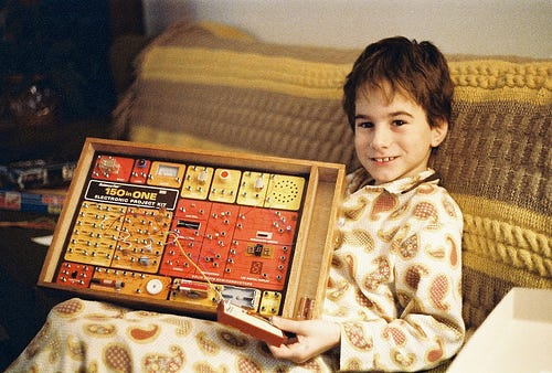 Jeff, 1978. Seated on the couch in his best 1970s paisley pajamas, Jeff holds the legendary Archer 150-in-One Electronic Project Kit. Long before STEM was a thing, these Radio Shack kits were how we learned the magic of electricity.